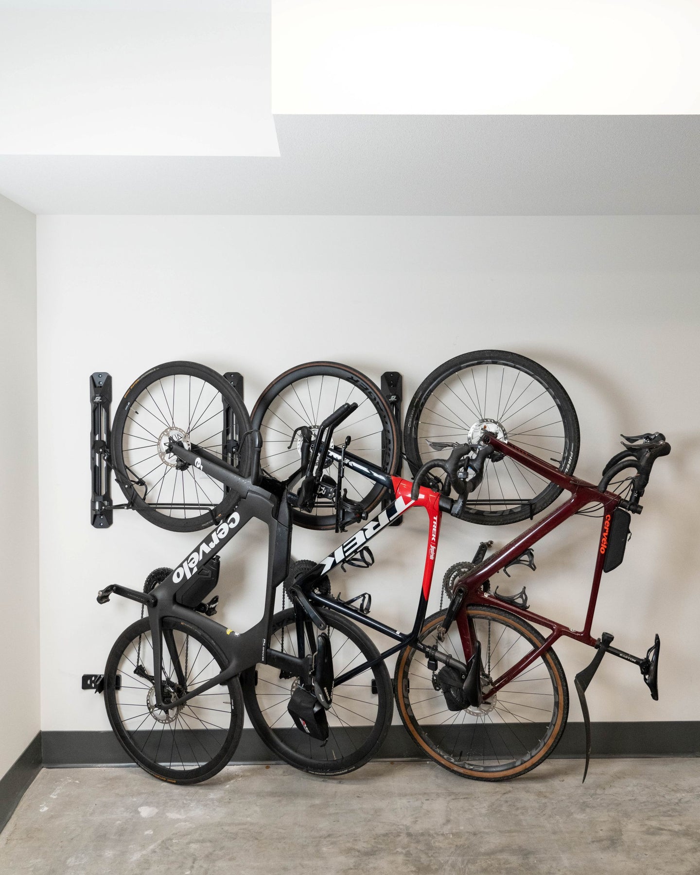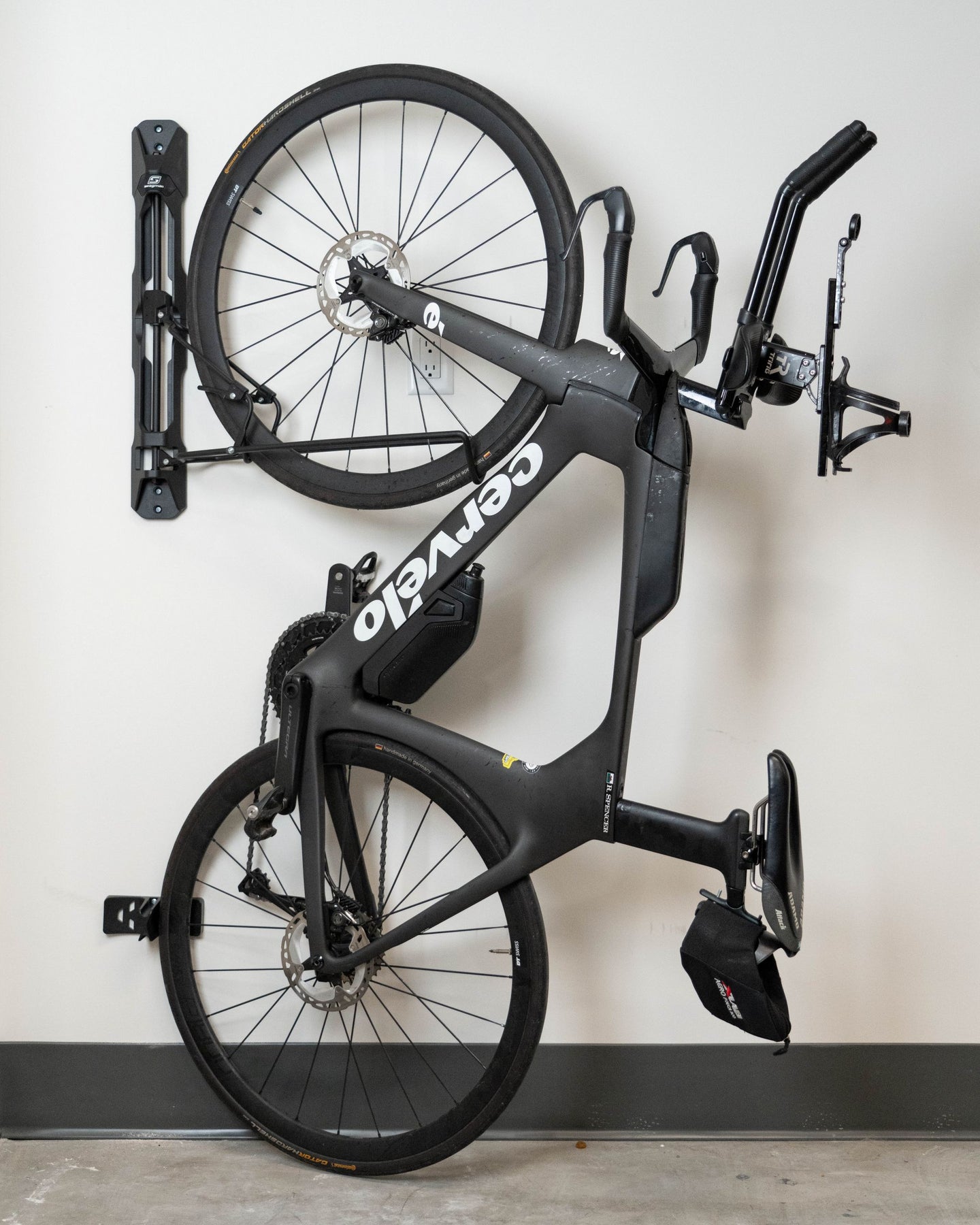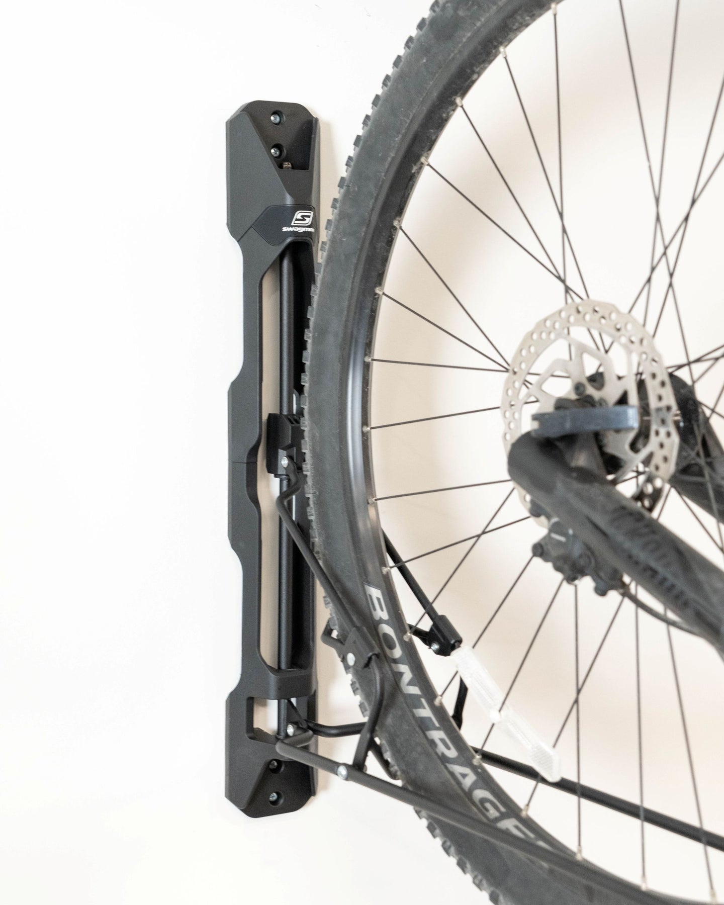 The Swagman Stow It is a space-saving wall-mounted bike rack designed for secure, zero-frame-contact storage. Holding your bike by the front wheel, it features a patented third point of contact that prevents rim damage—unlike other wheel-hanging racks that can scratch sidewalls. The rack pivots left or right, keeping bikes closer to the wall and allowing easy access when multiple bikes are mounted side-by-side. Strong, sleek, and thoughtfully engineered, the Stow It is the ideal solution for protecting your bikes while maximizing garage or storage space.